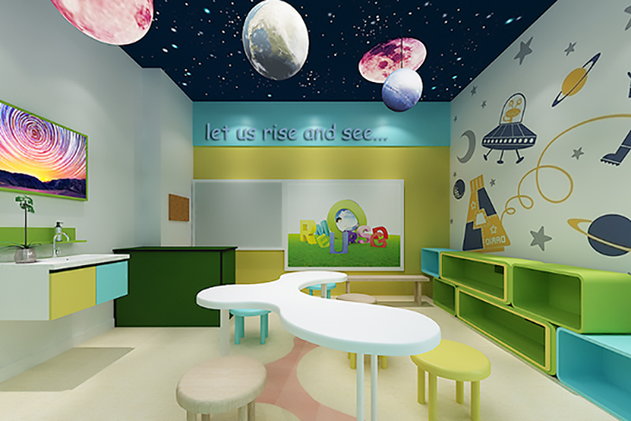 少兒英語(yǔ)培訓(xùn)學(xué)校一般會(huì)根據(jù)年齡的不同劃分為若干個(gè)班級(jí),設(shè)計(jì)師要根據(jù)空間面積合理劃分。設(shè)計(jì)師在設(shè)計(jì)的時(shí)候要盡可能的將學(xué)習(xí)區(qū)域與玩耍區(qū)域劃分開(kāi),保證孩子們有足夠的寬敞的活動(dòng)空間。對(duì)于角落空間可以制作儲(chǔ)物柜或者小擱架,不僅可以擴(kuò)大室內(nèi)空間,而且還可以形成美觀(guān)、流暢及統(tǒng)一的視覺(jué)效果。